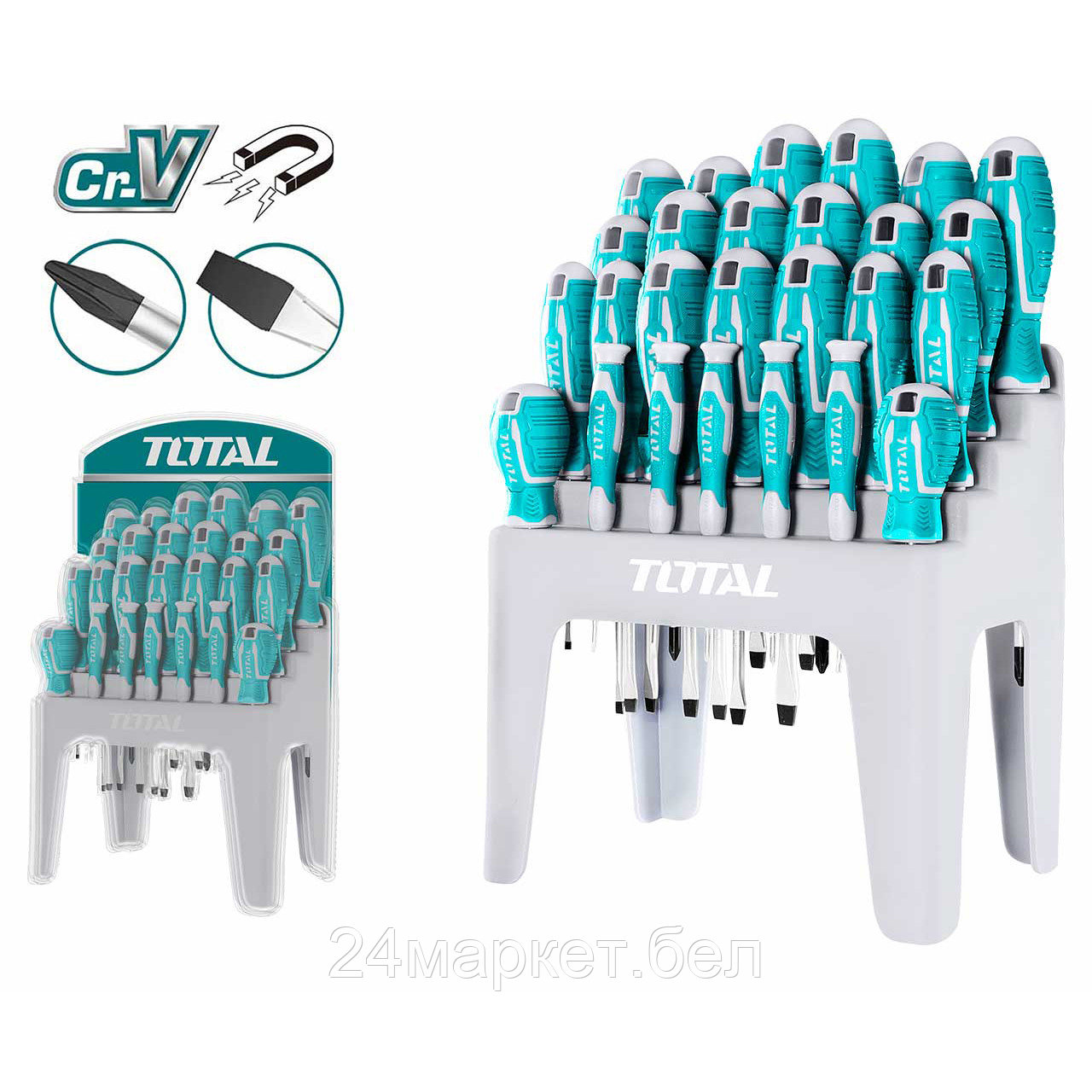 Кол-во предметов в наборе 26 шт., Материал хромованадиевая сталь (Cr-V). Набор из 26 отверток. Пластиковый стенд для хранения.